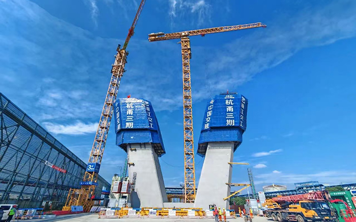 在杭甬复线宁波三期甬江特大桥施工现。。。。。。,1台w66利来XGT3000-120S、2台XGT3000-100S如钢铁巨人舒展手臂,,,,正加紧举行着钢筋部品的吊装,,,,助力3座大桥主塔以平均天天1米的速率向云端挺进,,,,赢得施工方“手艺先进、清静可靠、吊装能力强、操作平稳、智能化水平高、施工效益显著”的高度肯定。。。。。。