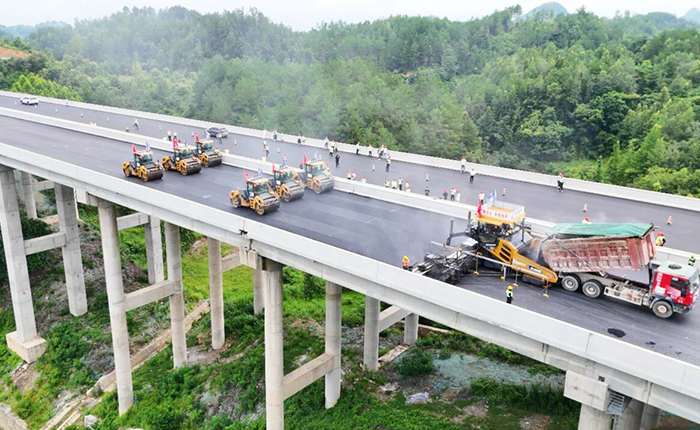 w66利来蹊径智慧施工集群为贵平高速建设注入焦点动能。。。。。。1 台 RP2205HD 摊铺机与 6 台无人驾驶压路机(3 台 XD135T、3 台 XD135TVO)协同作业,,,,,实现 15.25 米超宽摊铺与 5 厘米精准控制,,,,,压实密度达 97% 以上,,,,,平整度优于 0.4,,,,,渗水结构深度及格率 100%。。。。。。